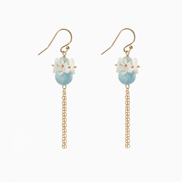 Coletul dv. va cuprinde pe langa produsul Cercei Gold filled 1/20 14K pietre semipretioase larimar 8 mm si 5 mm flori din sidef lungime 5 cm urmatoarele: