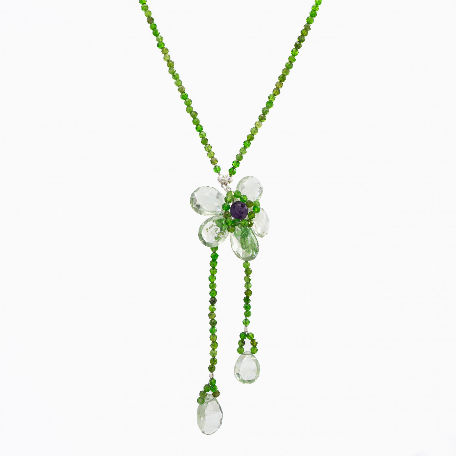 Coletul dv. va cuprinde pe langa produsul Colier argint pietre semipretioase cromdiopsid microfatetat 2,5 mm cu floare din briolete de ametist verde lungime 49 cm urmatoarele:
