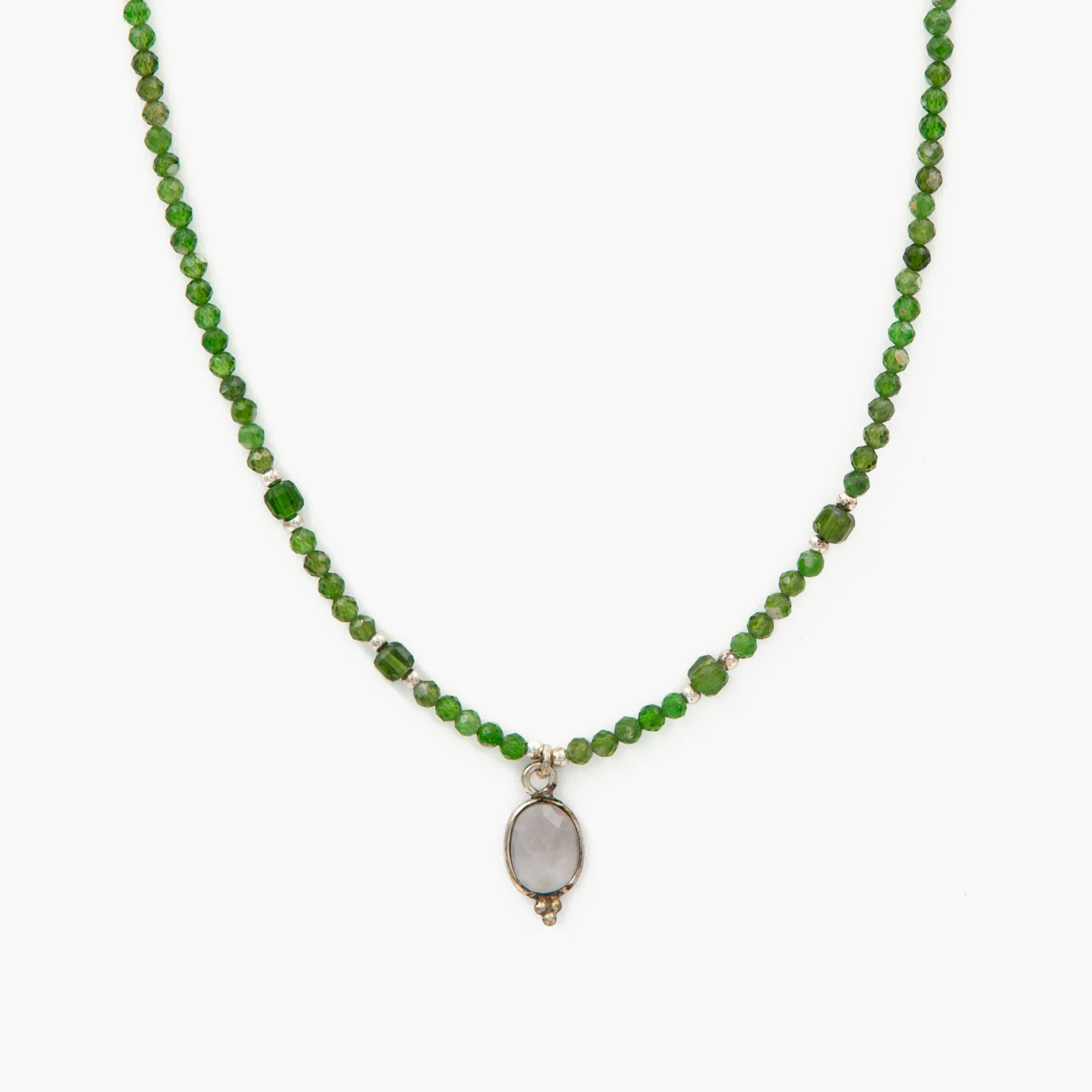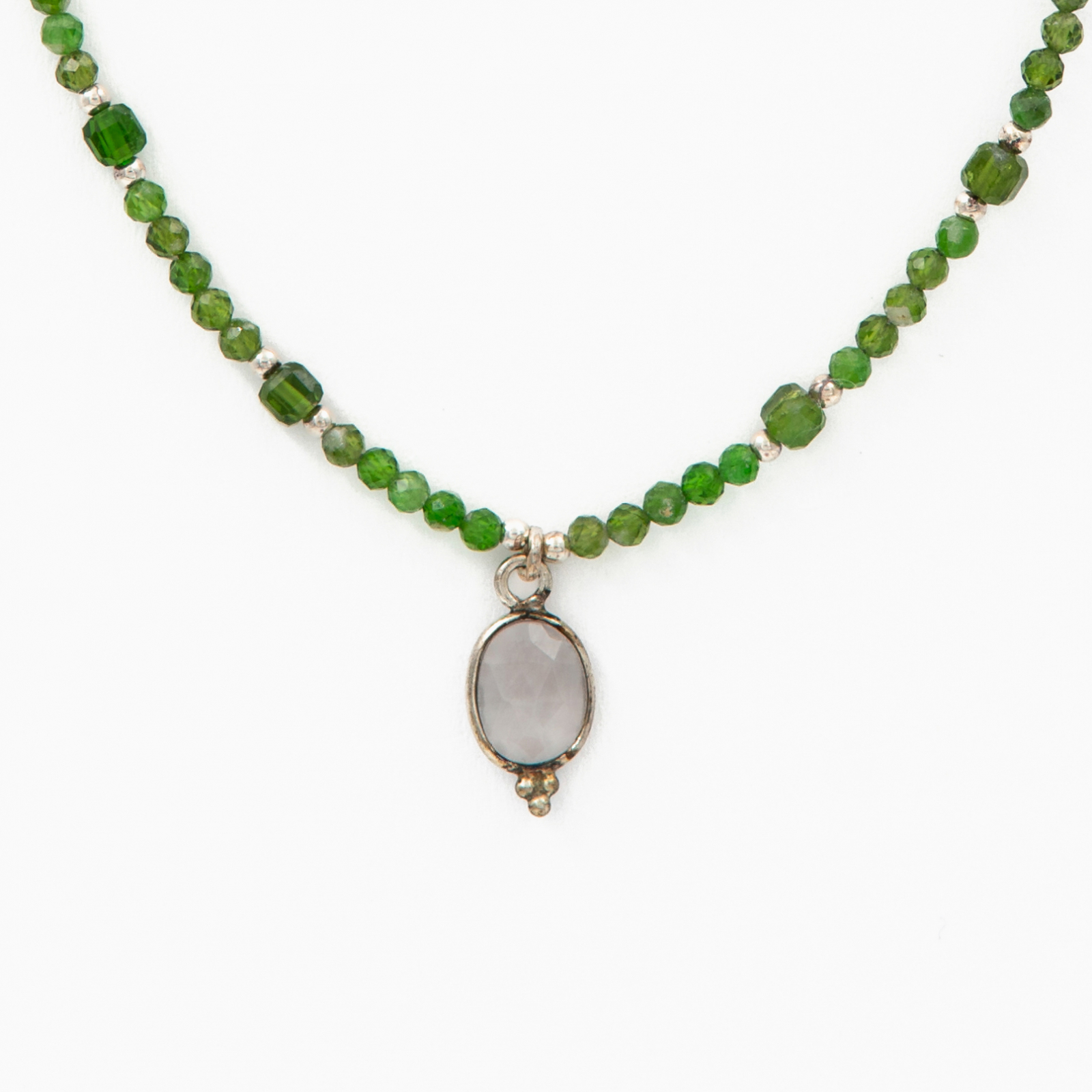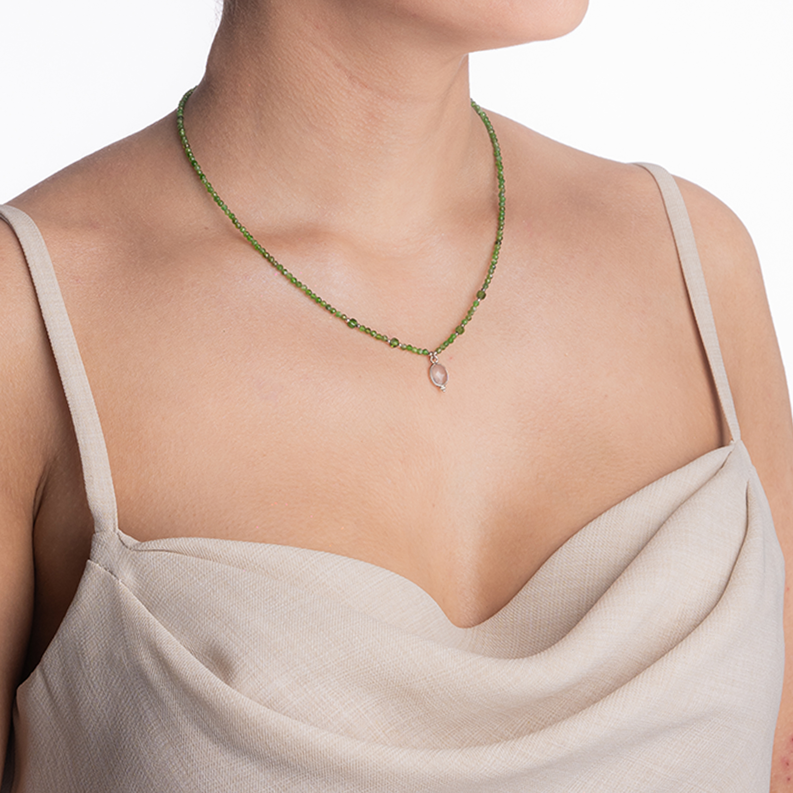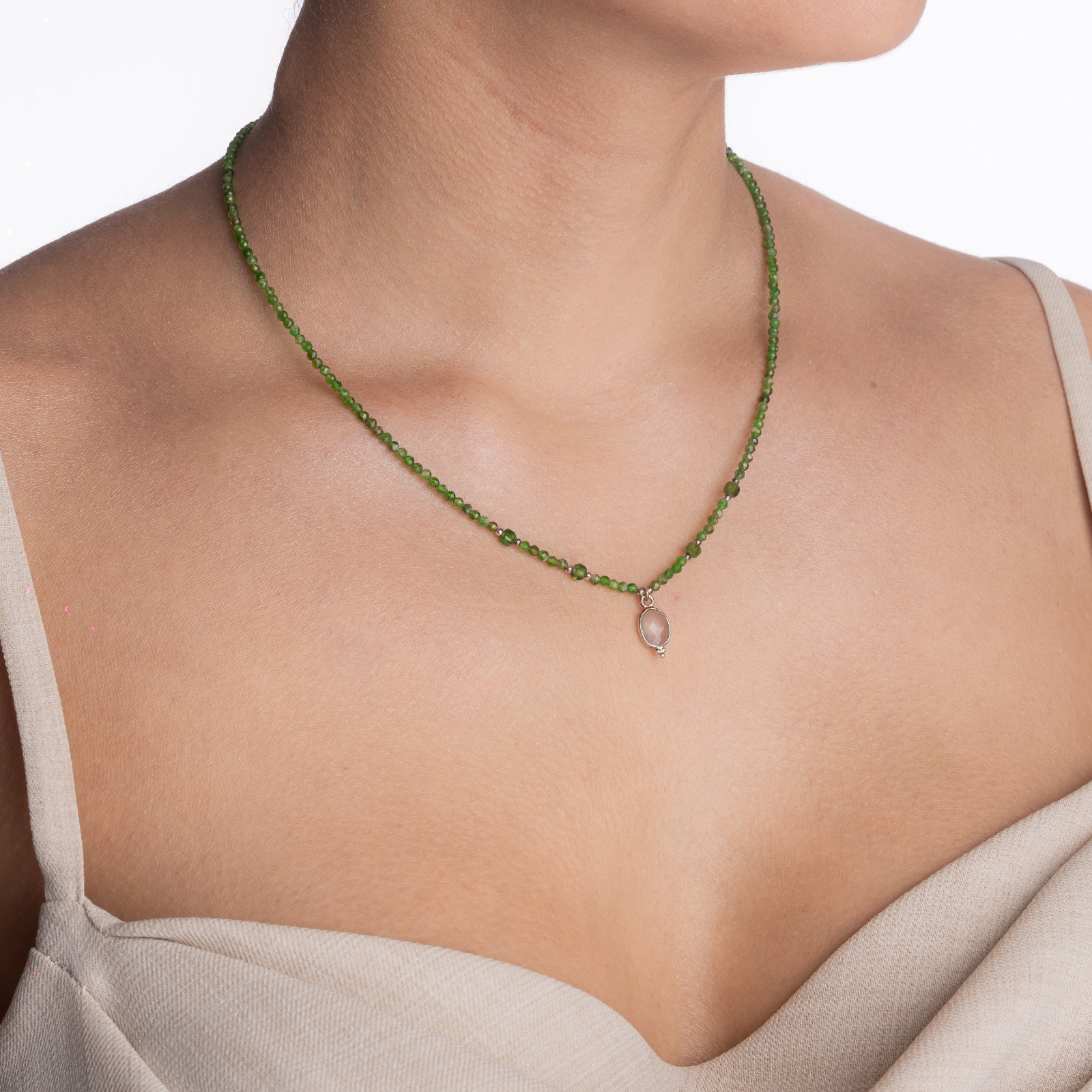 Coletul dv. va cuprinde pe langa produsul Colier argint pietre semipretioase microfatetate cromdiopsid 2 mm si accesoriu din cuart roz lungime 42 cm urmatoarele: