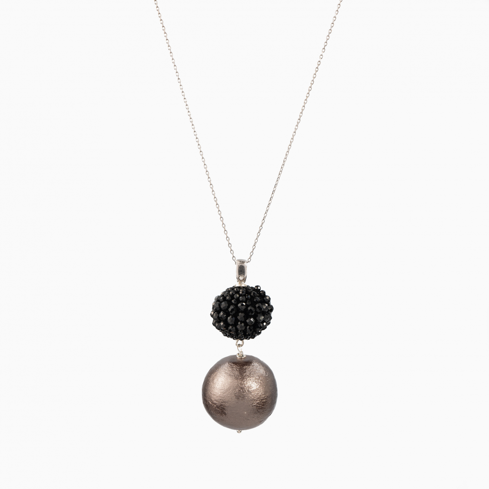 Silver pendant necklace with 16 mm black spinel bead and 25 mm bronze-tone Japan-style pearl bead
